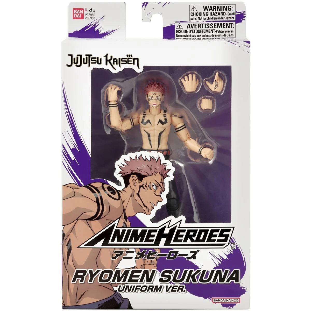 Ryomen Sukuna Uniform Version from Jujutsu Kaisen joins the 6 1/2-inch scale action figure series, Anime Heroes. This figure measures approximately 6-inches tall and includes 3x interchangeable hands. Ages 4 and up!