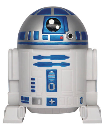 From Monogram Products. This is the droid you are looking for, and while it may not hold Princess Leia's stolen Death Star plans, it will hold your galactic credits! This Star Wars R2-D2 figural bank measures about 8 inches tall. Made of PVC.