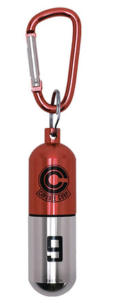 From Abysse America. Small and pill-shaped, DynoCaps allow users to carry and transport objects of all shapes and sizes around the Dragon Ball universe. Brought to life by ABYstyle, this polished metal keychain is a replica from the series and great for storing cash and knick-knacks. To open, unscrew the bottom of the capsule. The sturdy keyring clamp lets you put this keychain on your backpack, lanyard, or belt loop.